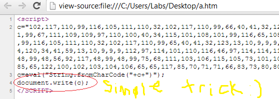 “C” değişkeni üzerine tanımlanan karakter kodları, javascript kodlari calıştırıldığı anda tekrar javascript ile karaktere çevrilmek suretiyle , yorumlanıyor ve document write functionu ile sayfaya script olarak dahil ediliyor.