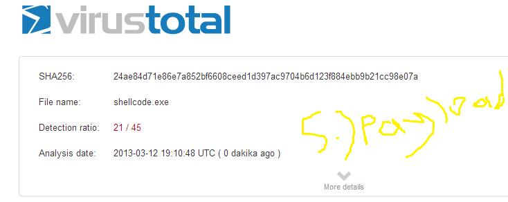 Sayfa içerisindeki oluşturulmuş olan javascript kodlari her ne kadar zararsız olarak gözüksede, IE (internet explorer) üzerindeki Use After Free zafiyetinden (CVE-2012-4969) yararlanarak, sistemde shellcode calıştırılmasına imkan tanıyor. İlgili shellcode ‘ un virus total analizini aşağıdaki resimde görebiliriz.